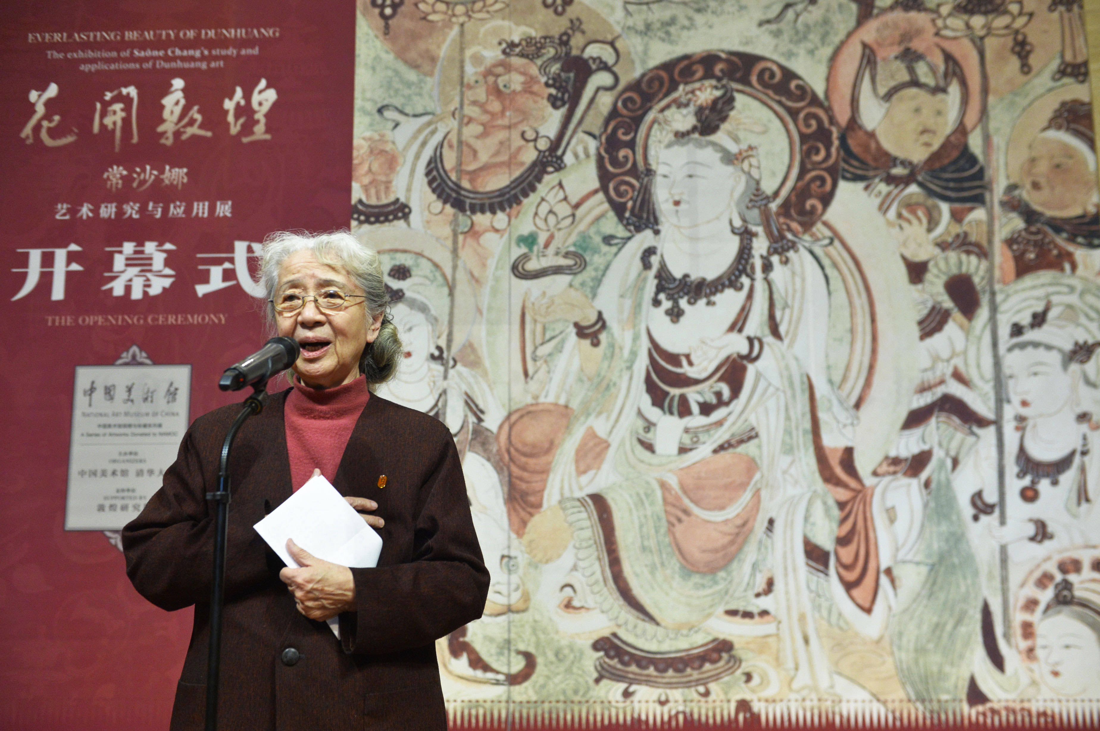 常沙娜在“花开敦煌——常沙娜艺术研究与应用展”开幕式上致辞。新华社记者 鲁鹏 摄《中国敦煌历代服饰图案》是常沙娜敦煌文化研究的精华,也是中国第一部系统梳理敦煌服饰艺术的著作。